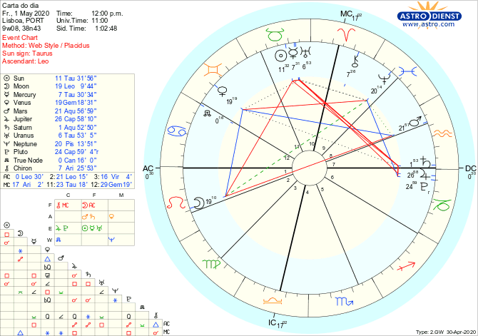 A manhã é mais harmoniosa do que a tarde já que conseguimos comunicar ou tentar fazer escolhas sem grande contestação, o que não acontece depois do almoço quando a Lua em Leão depois de um simpático sextil a Vénus em Gémeos faz oposição a Marte em Aquário e quincúncio a Neptuno em Peixes, aspecto este que nos ilude e faz acreditar que a razão é só nossa. Mesmo que seja, temos de nos sujeitar às restrições em curso e acompanhar a anulação do ego por um foco inteligente em novos valores de vida, finanças, até do que nos pode dar satisfação com o Sol, Mercúrio e Urano conjuntos em Touro.