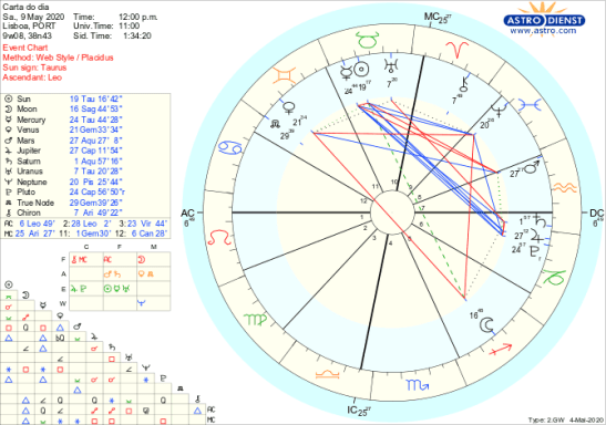 No entanto essa concretização ou discurso sobre o que se pretende atingir, tem de ser feito em moldes diferentes dos habituais e vamos tomar consciência disso quando no domingo ao fim do dia, com a Lua já em Capricórnio – a fazer-nos ambicionar e temer uma nova ordem que tem de ser adoptada, -se encontrar em trígono a Urano em Touro. Num flash teremos o entendimento de como nos organizarmos de uma nova forma, abertos a várias opções mas cientes do que é a verdade em que têm de estar assentes. A Lua faz no Domingo ao sair de Sagitário, conjunção ao Nódulo Sul e oposição ao Nódulo Norte agora em Gémeos e com esse aspecto mostra-nos em simultâneo passado e futuro que de seguida, ao entrar em Capricórnio, vamos tentar estruturar.