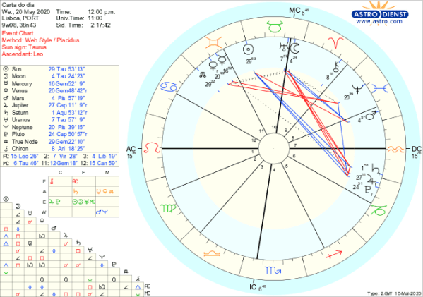 Mantermo-nos estáveis apesar das surpresas e contrariedades é o grande desafio do dia. Há duas mudanças grandes de energia hoje com o Sol a entrar em Gémeos, em trígono a Saturno retrógrado em Aquário e a Lua a entrar em Touro onde faz quadratura a Saturno e conjunção a Urano. Assim, a nossa energia vital aposta na comunicação, na trocas, no comércio, nas movimentações de bairro, tudo actividades que com a devida reserva da retrogradação de Saturno, conseguimos executar de forma séria, a pensar no longo prazo e no interesse colectivo. No entanto, a Lua em Touro quadrada a Saturno e conjunta a Urano aflige-nos emocionalmente, cria insegurança, dúvidas sobre o que é ou não válido e traz sentimentos de frustração e repressão com origem na ordem estabelecida. As surpresas e golpes emocionais são prováveis mas graças ao trígono do Sol a Saturno aguentamos o embate . No entanto vivemos desde já e até ao eclipse da Lua Cheia a 5 de Junho, uma tensão crescente com a aproximação da quadratura do Sol em Gémeos a Marte em Peixes. É um aspecto de conflito entre dois símbolos enérgicos em signos duais e a tensão e confusão é inevitável: afinal como é??? Aproveitemos hoje e amanhã em que há sinais de estabilização para preparar terreno para tempos mais complexos.