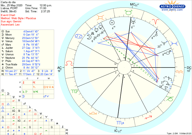 Com Mercúrio, Vénus e o Nódulo Norte, tal como o Sol, em Gémeos, estão reforçados todos os intercâmbios, movimento e comunicação que, pelo quincúncio a Plutão e Júpiter retrógrados . em Capricórnio, sejam a expressão da resolução das tensões provocadas pelas recentes alterações à ordem colectiva.