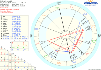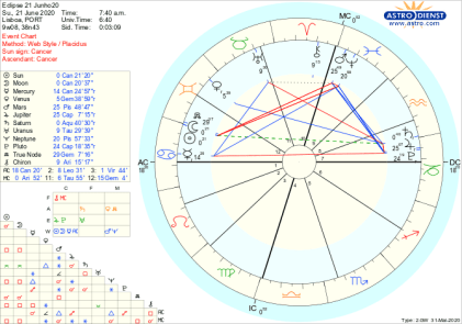 Voltando às interpretações de Brady,  devemos então ver neste mês de Junho um eclipse de uma série que ilustra restrições, bloqueios e pouca clareza na percepção do que se está a passar. E quais são os aspectos específicos?  Por ocorrer no Solstício, em 0 graus de Caranguejo, em conjunção fora de sigo ao Nódulo Norte e em quincúncio a Saturno em Aquário e em quadratura larga a Neptuno e Marte em Peixes, reforça a ideia de que vamos acreditar que estamos em segurança, que não queremos nem precisamos de restrições mas de facto tudo isso pode ser ilusão… ilusão essa que vamos ter de rever rapidamente porque Neptuno entra retrógrado dias depois do Solstício, a 23 de Junho,  seguido de Vénus directa em Gémeos a 26,  encorajando o comércio e as viagens e relações económicas, como se tudo fosse como dantes…