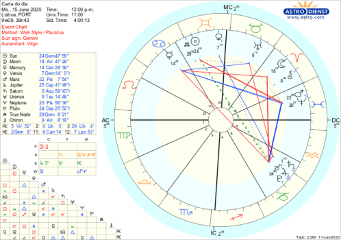 A Lua está em Carneiro em quadratura a Mercúrio em Caranguejo e a Plutão e Júpiter em Capricórnio. Marte que rege o Carneiro está em Peixes conjunto a Neptuno, quadrados ao Sol e ao Nódulo Norte em Gémeos. Saturno é o dispositor final destes aspectos o que resume os resultados a ordem, limites, repressão, responsabilidade, paciência.