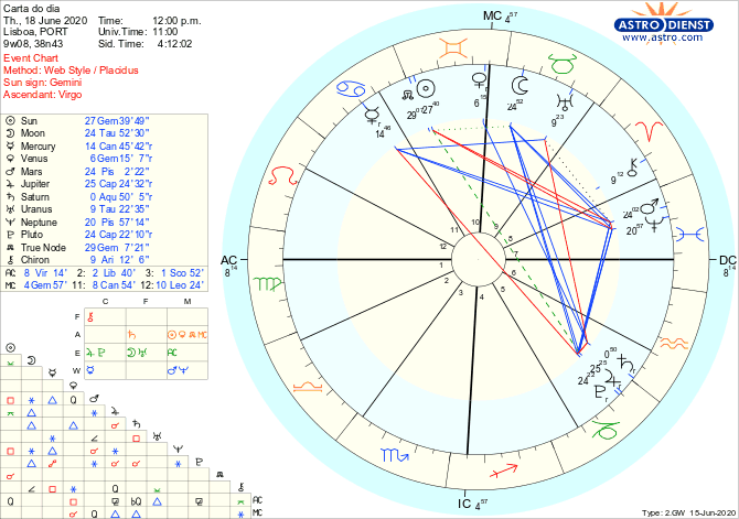 Questionar, informar, trocar informações é a atitude solar precede a procura de resultados dada a conjunção do Sol em Gémeos ao Nódulo Norte. O tempo é rápido e devemos ser capazes de olhar em múltiplas direcções para melhor fundamentar decisões. Esta é uma tarefa importante e que devemos executar o mais conscientemente possível. Quando na sexta Mercúrio entrar retrógrado vamos ter de questionar as nossas dependências mais íntimas que condicionem as escolhas de futuro.