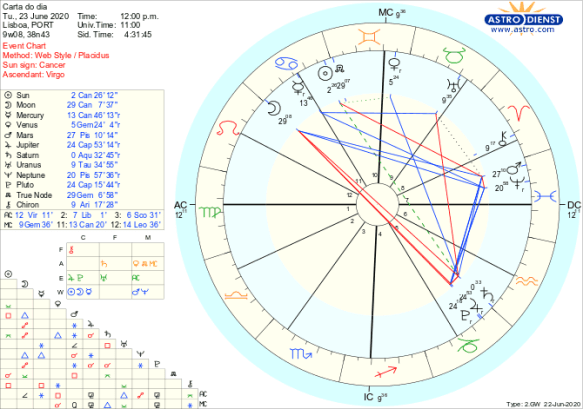 Ou seja, a fragilidade da manhã transforma-se na impossibilidade de levantar cabeça pela tarde… Só a sensibilidade que o trígono da manhã entre a Lua a Neptuno acorda é que permite bem gerir o do dia já que o orgulho ou dramatismo a que a entrada da Lua em Leão apela serão sempre contrariados pelas regras que se impõem ao colectivo. A reforçar esta ideia, o quincúncio a Saturno do Sol em Caranguejo -que a Lua rege – aponta para a dificuldade em nos sentirmos seguros ou em resolver questões de família ou de casa devido a pressões externas ou quaisquer circunstâncias que não dominamos, com uma incapacidade ou frustração de acção hoje e nos próximos dias com a quadratura do Sol a Quíron em Carneiro.