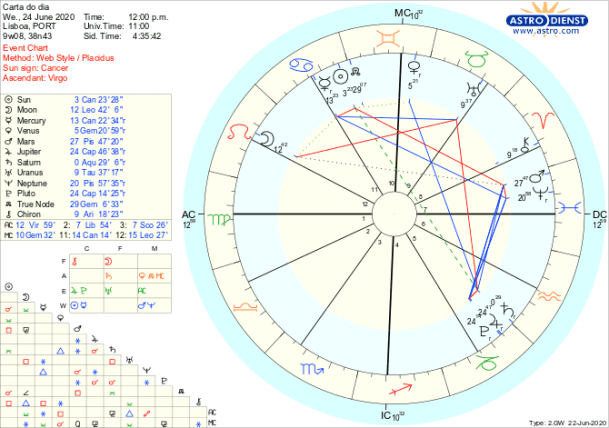 Mas é preciso não esquecer que Plutão, Neptuno, Saturno, Júpiter e Mercúrio estão retrógrados assim como Vénus que só entra directa amanhã. Tudo o que acontece e o que temos de fazer prende-se ao passado e ao que ficou por resolver. É nesse quadro e a pensar no futuro quando estiverem de novo na sua maioria directos no Outono que há agora que fazer as escolhas mais adequadas para minimizar os impactos posteriores.