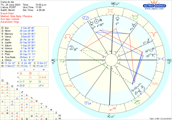 De facto, não há hoje respostas fáceis e vivemos a tensão entre a insatisfação da possibilidade de agir e a busca de segurança emocional, doméstica ou familiar, com o Sol em Caranguejo em quadratura a Quíron em Carneiro. No fundo desejamos coisas contraditórias, seja materialmente seja nas relações, na busca em que andamos de valores diferentes que reflictam uma nova materialidade. Isto vem da entrada directa de Vénus em Gémeos, em semi-sextil a Urano em Touro, signo que Vénus rege.