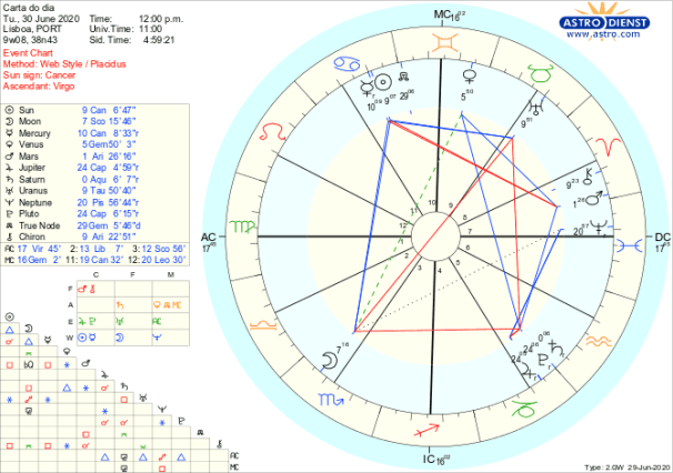 Interiormente hoje não estamos divididos e todas as contrariedades vêm de fora. A Lua em Escorpião faz trígono ao Sol e mais tarde a Mercúrio retrógrado em Caranguejo e o ego e a sensibilidade fluem e articulam-se para proteger o “ninho” emocional, familiar, doméstico ou nacional. E proteger de quê? Proteger da oposição a Urano em Touro que nos confronta com a necessidade de adoptarmos novos valores de vida e nos libertarmos de certas amarras materiais; proteger das restrições sociais que vêm da quadratura a Saturno em Aquário; proteger do que parecem ser forças incontroláveis de mudança estrutural simbolizadas pela segunda conjunção deste ano de Júpiter a Plutão. Marte em Carneiro a aproximar-se de uma conjunção a Quíron simboliza ímpeto e frustração. Apenas o quincúncio da Lua a Vénus em Gémeos nos dá um bom conselho: flexibilidade e o bom senso que vem do controlo das emoções, salvam o dia e orientam a semana.