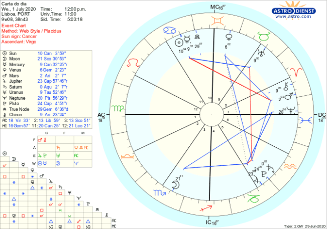 Hoje é mais fácil dominar as situações e, com uma lógica segura mas inovadora, fazer as mudanças profundas na organização das coisas que temos vindo a idealizar. Um trígono da Lua em Escorpião a Neptuno em Peixes é o motor emocional que põe em marcha a criação de condições tranquilizadoras e inteligentemente diferentes – com Sol e Mercúrio em Caranguejo em sextil a Urano em Touro. E o sextil da Lua – que rege o Caranguejo- a Júpiter, Plutão e Saturno – que pelo final do dia, em retrogradação volta a Capricórnio- permite avançar para a recriação de uma ordem adequada aos tempos de correcção de situações anteriores. Este re-ingresso de Saturo em Capricórnio simboliza a necessidade de revisão de fundações tóxicas, de gestões autoritárias, de estruturas ultrapassadas de vida e de governo. Saturno só volta a Aquário em finais de Dezembro por isso temos seis meses pela frente para identificar e eliminar áreas ou modos de construir novas realidades estagnados o que exige franqueza, coragem e mais consciência do longo prazo do que pressa.