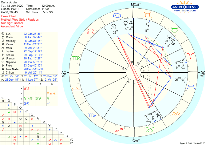 Hoje é dia de revelações, surpresas e oportunidades de encarar o futuro com outra responsabilidade mas o seu impacto implica mudanças radicais. Como pano de fundo há uma tendência para exagerar ou não prestar atenção e acabar por ter comportamentos excessivos com o Sol em Caranguejo oposto a Júpiter em Capricórnio, exacto pelo meio do dia. O que quer que seja, é grande e agita-nos emocionalmente porque sentimos ameaçada a segurança a que estamos habituados. No entanto estas energias são de curta duração porque logo se segue a oposição do Sol a Plutão exacta na quarta feira e a oposição a Saturno que dura até terça 21, sinais de crise entre aquilo a que nos queremos agarrar e forças externas que nos empurram para os fundos dos quais temos que emergir com novas responsabilidades e peso de acções passadas que agora nos mostram as suas consequências, os Karmas de Saturno..