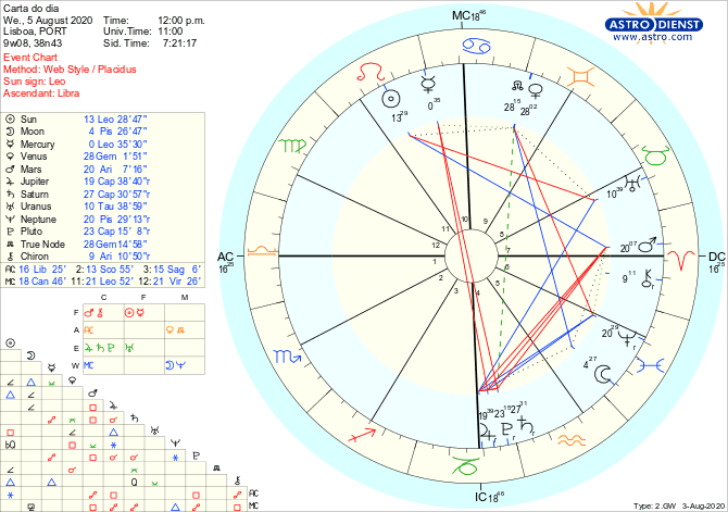 Mercúrio rege Gémeos onde estão conjuntos Vénus e o Nódulo Norte em quincúncio a Saturno retrógrado em Capricórnio. Isto traduz-se numa certa tensão entre os limites e regras existentes que estão a ser re-avaliados e a possibilidade de nos abrirmos a outras opções. Com Mercúrio em Leão podemos pensar em voz alta quais os melhores caminhos a tomar mas não temos de agir já, apenas começar a tomar posições que poderemos ir corrigindo ao longo do processo de retrogradação de Júpiter, Plutão e Saturno.
