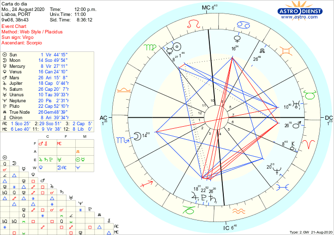 É preciso ter cuidado esta manhã para não ter reações súbitas de que nos podemos arrepender. Nada de ir atrás de impulsos, raivas ou gestos de ruptura e também não nos devemos surpreender se de facto acontecer o inesperado e tivermos mesmo de abandonar bens ou valores a que preferiamos ter de ficar agarrados… De facto, com o Sol e Mercúrio conjuntos em Virgem o que serve ou não serve e a lógica da funcionalidade domina a razão.