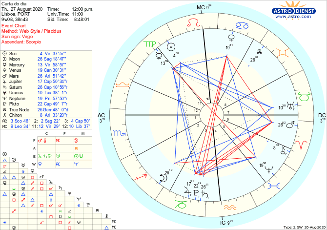 É certo que de manhã -ou por volta do meio dia,- com a Lua ainda em Sagitário, em trígono a Marte em Carneiro, conseguimos ter iniciativas ou, pelo menos, apresentar os projectos que nos movem mas há um aspecto bastante frustrante nos Céus que vai durar, de forma mais ou menos exacta até ao início do próximo ano e que é um verdadeiro travão à expressão espontânea da vontade: Marte em Carneiro, agora em quadratura exacta a Saturno retrógrado em Capricórnio, vai voltar a estar nesse aspecto exacto no final de Setembro, príncipio de Outubro, com Marte retrógrado e Saturno directo. Estão numa órbita de 10 graus no final de Outubro. Marte entra directo em meados de Novembro aproximando-se novamente de uma quadratura a Saturno já em meados de Janeiro de 2021, com Marte nos primeiros graus de Touro e Saturno nos primeiros graus de Aquário.