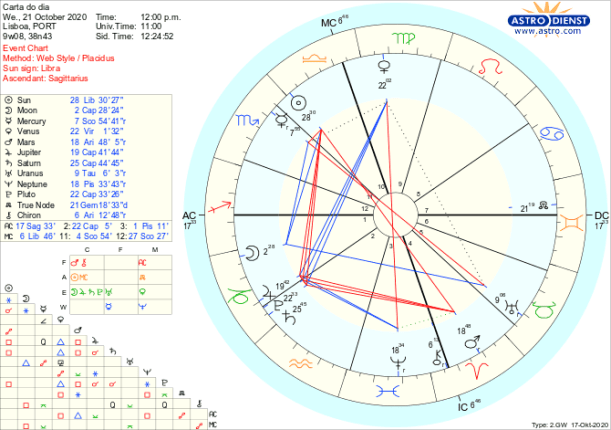 Só podemos fazer o que está ao nosso alcance o que começa, com os trânsitos de hoje, por nos re-organizarmos cuidadosamente, atentos ao que se passa à nossa volta, minimizando impactos, atentos ao pormenor e ao bem estar de quem nos é próximo. Com Mercúrio, Marte, Urano e Neptuno retrógrado serão pequenos passos de correcção do que falta estruturar antes de podermos passar a situações mais esclarecidas ou prometedoras…