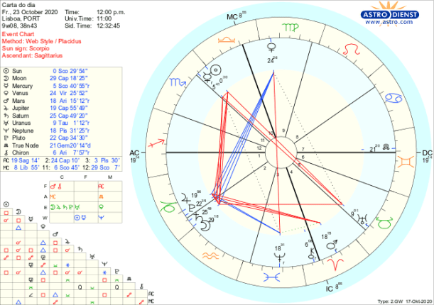 O Sol em Escorpião avança também para uma oposição a Urano em Touro, aspecto que fica exacto a 30, 31 deste mês e 1 de Novembro que serão dias de imensa tensão, incerteza, instabilidade enfim, todas as variantes que traduzam o choque entre o que controlamos e as mudanças externas, mudanças de valores ou de condições de segurança que nos surpreendem e enervam. Para lá caminhamos e a entrada hoje do Sol em Escorpião vem já carregada dessa ameaça ao nosso domínio das situações.