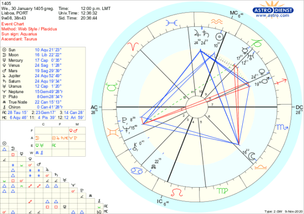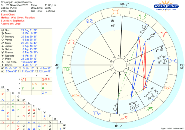 Aqui estão os horóscopos da última conjunção de Júpiter e Saturno em Aquário em 1405 e da próxima em Dezembro deste ano. Nesta, a semi-quadratura da Lua conjunta a Neptuno em Peixes aos planetas da Grande Conjunção e a quadratura de Marte a Plutão é um bocadinho um corte na fantasia de facilidade que se possamos vir a ter neste processo… vem aí a Era do Aquário mas não chega sem túmultos…