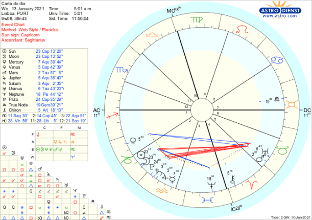 Assim, se por um lado há um apelo à ordem e responsabilidade dentro de um novo quadro – há também uma volatilidade imensa que se desenha com Urano e Marte e que tenderá a amplificar-se com a quadratura de Saturno e Urano no início de Fevereiro. Queremos paz e descanso mas não está para breve…e é bom lembrar o que está na origem do desassossego que estamos e estaremos a viver em 2021. Tudo começou há exactamente um ano atrás, quando se abriu novo ciclo colectivo com a conjunção de Saturno e Plutão a que se juntaram Júpiter e Marte. A Lua Nova desta semana, no dia 13, a 23 graus, um grau acima da conjunção Saturno Plutão de 2020, simboliza bem o facto de estarmos um degrau acima na reconstrução da organização pessoal e colectiva, com Urano que também entrou directo no ano passado em Janeiro depois dessa conjunção, a voltar novamente a moção directa agora depois da Lua Nova. É este Urano que estimula a libertação de velhos padrões de valores seja passarmos a ganhar a vida em tele-trabalho, fazermos pagamentos digitais, sermos controlados pela inteligência artificial ou encontramos novas maneiras de gerir a Terra e a sua riqueza natural.
