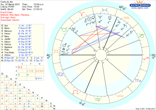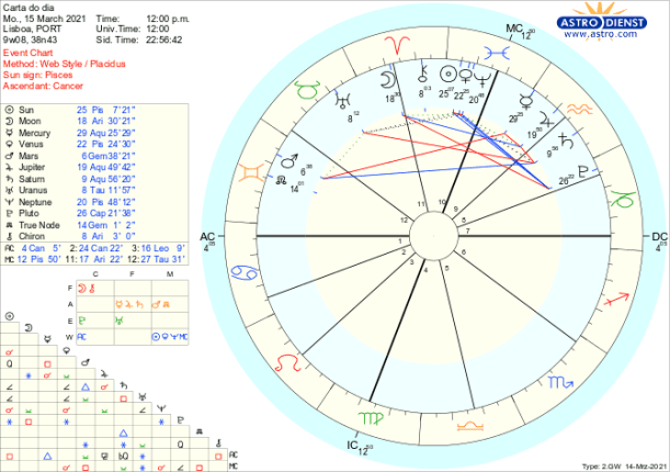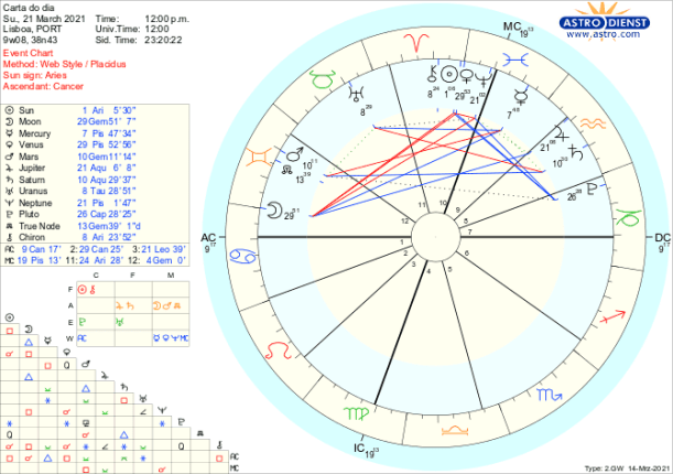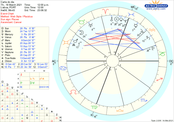 É também na terça e quarta feira que o Sol e Vénus, de Peixes, fazem sextil a Plutão em Capricórnio. Para melhor entender o potencial deste sextil, temos de recuar à segunda semana de Janeiro, quando o Sol fez conjunção a Plutão e Urano entrou directo. Foi nessa altura que em Portugal foi verificada uma nova situação de “calamidade pública” e instituído novo estado de emergência e confinamento. Agora no sextil começa o desconfinamento gradual, já que os sextis simbolizam oportunidades de evolução. Veremos onde estamos quando a 16 de Abril o Sol fizer quadratura a Plutão.