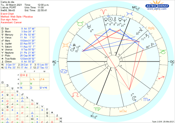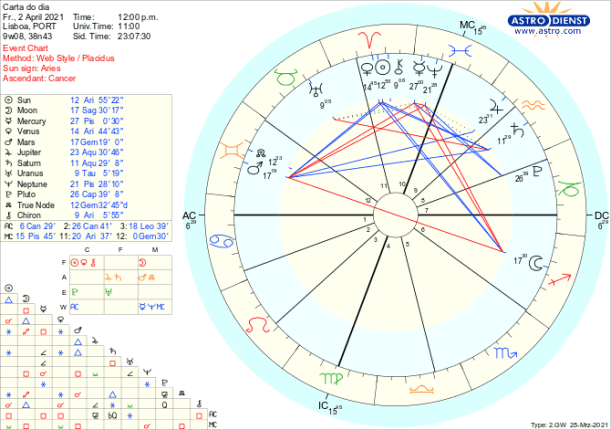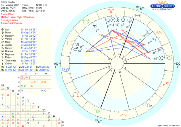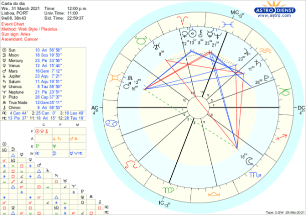 O sextil de Marte, esta semana, a Vénus e ao Sol traz-nos oportunidades de explorar hipóteses, procurar como melhor vir a exprimir esse desejo de acção num futuro próximo, enquanto o trígono de Marte a Saturno em Aquário garante que tudo tenha enquadramento dentro de um sistema de regras e de responsabilidades. Estas lembram que, apesar do impulso para agirmos individualmente, há que não esquecer que fazemos parte de um todo organizado ao qual não vamos resistir mas sim alinhar para garantir o funcionamento. É a aproximação de um trígono de Marte a Júpiter também em Aquário, que será exacto na próxima Lua Nova de 12 de Abril, que permite antever que estamos colectivamente a dar o melhor para podermos começar de novo aquilo que desde 22 de Março tanto desejamos poder fazer.