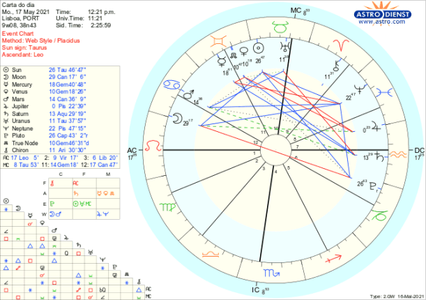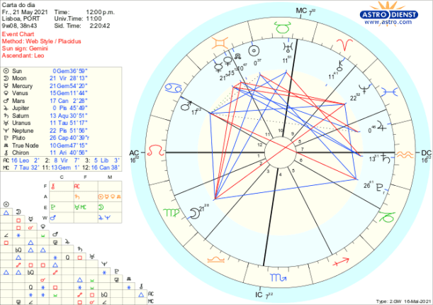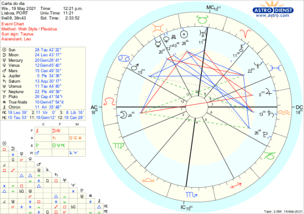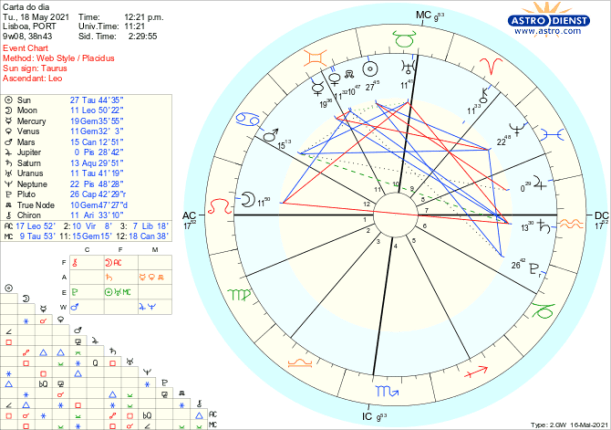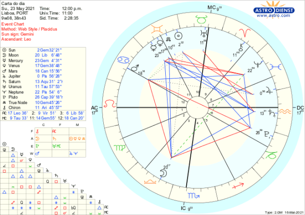 Com Plutão e Saturno a dar-nos lentamente que pensar e corrigir, em choque com a urgência libertadora para novos valores e realidades marcada por Urano em Touro, o que nos deve guiar neste processo de avanços,recuos e safanões? Em primeiro lugar temos o Nódulo Norte em Gémeos e dois eclipses no eixo Gémeos/Sagitário, um total da Lua a 26 de Maio e outro, anular do Sol a 10 de Junho. Estes são sinais de que é na conciliação entre a busca de opções e o sentido da verdade que temos de encontrar o rumo. E como Júpiter que rege o Sagitário entrou esta semana em Peixes, que também rege, vemos reforçada a importância de acreditar em algo maior, em princípios universais, numa espiritualidade que não podemos deixar que vire fanatismo de risco acrescido pelo sesquiquadrado entre Júpiter em Peixes e Marte em Caranguejo regido por uma Lua conservadora, protectora dos valores tradicionais e dos nacionalismos e que se aproxima de um trígono a Neptuno com um grande potencial de alimentar fantasias, ilusões espirituais ou guerras santas.