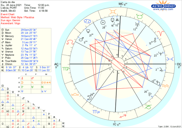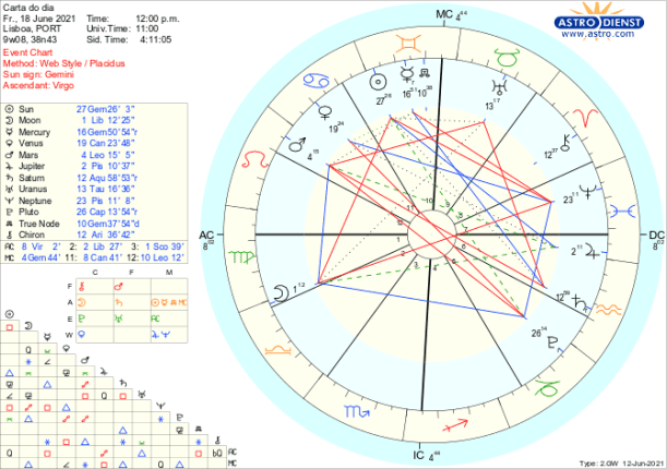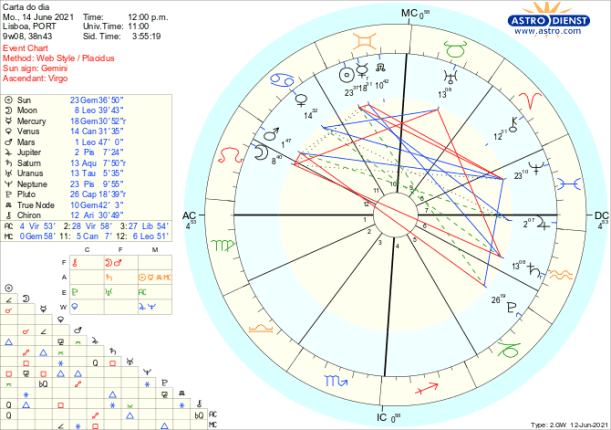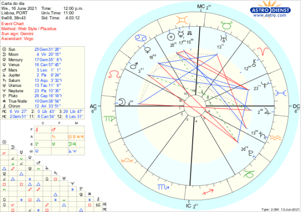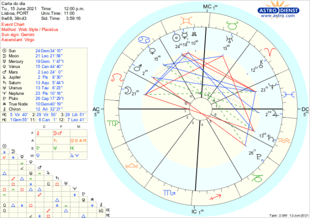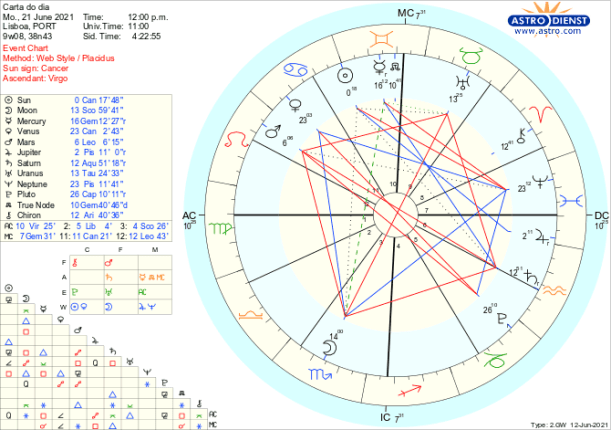 Sexta, sábado e na manhã de domingo a Lua em Balança sensibiliza-nos para procurar equilíbrios, justiça, acordos. Um trígono a Saturno no sábado de manhã traz-nos estabilidade, estamos na relação certa no sítio certa. No domingo pela manhã a Lua está em trígono ao Sol mas em quadratura a Plutão o que alinha mente e emoções mas estas têm de ser purgadas de velhos condicionamentos o que nem sempre é fácil, mas necessário. A ajudar um happy ending da semana, Vénus em Caranguejo em trígono a Neptuno em Peixes torna tudo mais cor-de-rosa e encontramos um espaço confortável entre o material ou fisico e o emocional ou espiritual. Isto permite carregar as baterias para a nova etapa que começa segunda -feira 21, o Solstício com a entrada do Sol em Caranguejo.