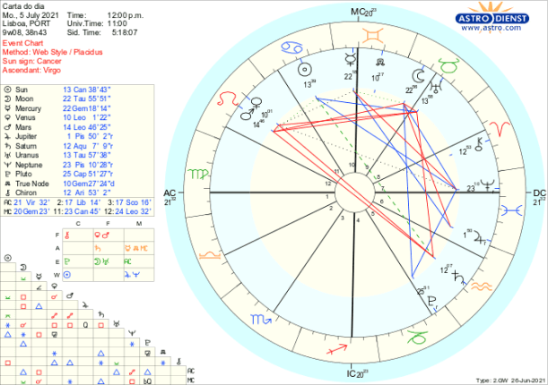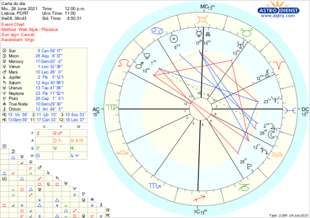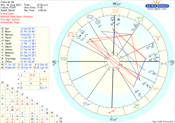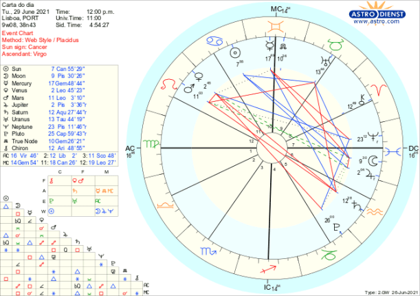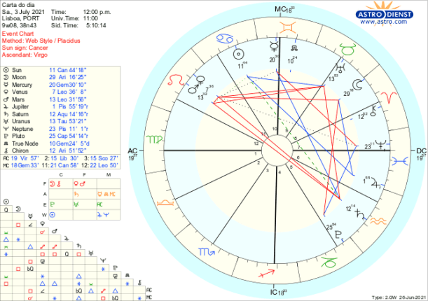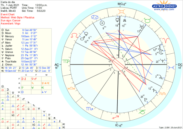 É interessante antecipar que, se esta semana é Marte que activa a quadratura Saturno/Urano, para a semana será Vénus -que já entrou em Leão-, de seguida a Lua Cheia, conjunta a Saturno no dia 24 de Julho e, por fim, o Sol e Mercúrio, na primeira semana de Agosto. Ou seja, todos os chamados planetas pessoais- Sol, Lua, Mercúrio, Vénus e Marte, vão, desde este final de Junho até ao princípio de Agosto, ter de enfrentar regras em revisão com Saturno retrógrado- e o impulso cada vez maior de liberdade, proporcionado por Urano que só entra retrógrado a 20 de Agosto. Primeiro a vontade cega – Marte, de seguida o desejo- Vénus, depois os medos- a Lua, a que se somam no arranque de Agosto toda a energia vital- Sol, e a forma de comunicar- Mercúrio vão ser postos à prova e só passará o teste quem conseguir equilibrar as energias do ego à força das circunstâncias.