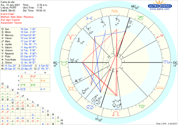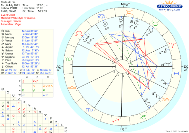 Parece assim que, com esse trânsitos, os Ceús nos incitam à revelia, de forma inexplicável, enquanto em simultâneo o Sol em Caranguejo, de um sextil a Urano até a um trígono a Neptuno, nos pede uma segurança idealizada mesmo que sob circunstâncias novas. No fundo, estamos numa semana em que se queimam mais uns “últimos cartuxos” da tensão entre o novo e o velho, exacerbada desde o final de maio com a quadratura de Saturno e Urano, agora afastar-se- antes de voltar a acontecer em Dezembro….. Fecham-se capítulos, abrem-se outros, mas o enredo mantém-se..