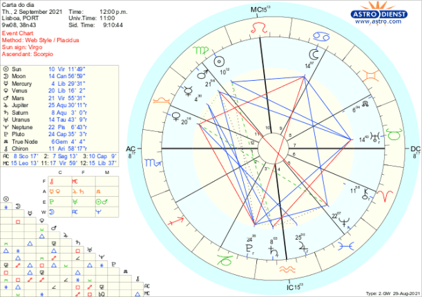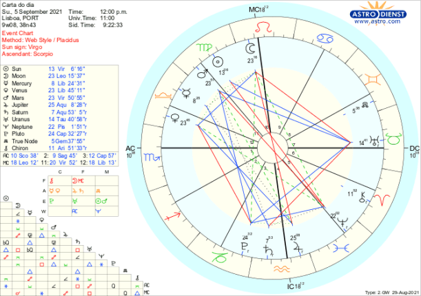 Durante toda a semana e até dia 22 o Sol está Virgem e Mercúrio seu regente em Balança o que obriga a um esforço de diálogo e de busca de soluções equilibradas para as questões práticas que se vão levantando. Vénus também está em Balança até dia 11 o que ajuda ao com entendimento mas este não está isento de tensões em particular na Lua Nova de Virgem, no dia 7 em que enquanto Marte faz trígono a Plutão e temos novos começos, Vénus faz-lhe quadratura e algo tem de ceder….