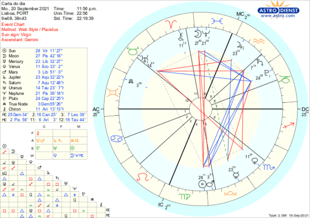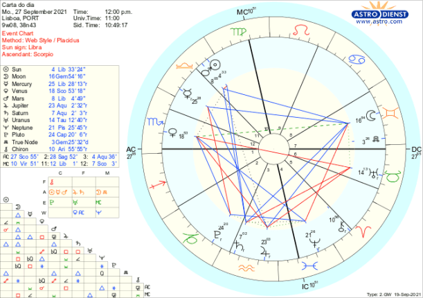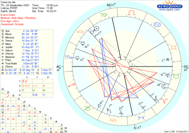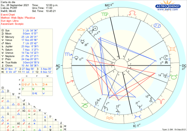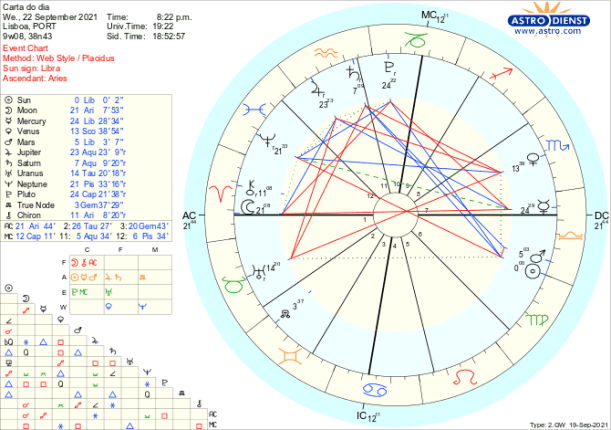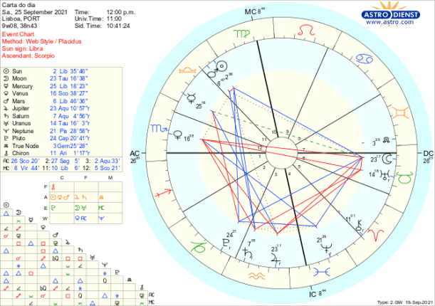 E é para esse equilíbrio entre o Eu e o Outro que os Céus se viram neste equinócio de Setembro, momento do ano em que noite e dia têm a mesma duração e em que pelo simbolismo da Balança a busca de paz, justiça, acordos e paridade estarão de uma forma ou de outra na agenda de todos. Passamos assim desta Lua Cheia para o Equinócio como quem passa do conflito interior entre sonho e detalhe para, paradoxalmente, o conflito externo pela busca de paz. É a presença em Escorpião de Vénus, que rege a Balança, que nos leva a lutar pela harmonia, ameaçada também pela presença de Marte, o guerreiro, em Balança, signo do equilíbrio. Assim, tanto Vénus como Marte estão detrimento, em trânsito nos signos que se opõem aos signos que correspondem à sua natureza. Marte quer acção mas em Balança não pode faze-lo sem conflito. Vénus em Escorpião quer ir ao fundo das questões e revelar a verdade para alcançar a paz, mas isto só se traduz em confrontos. Temos assim pela frente uns tempos em que a paz está permanentemente comprometida porque não é alcançável sem conflito. O facto de Mercúrio em Balança entrar retrógrado dia 27 sublinha igualmente essa necessidade de rever a lógica de compromissos exacerbada desde já e nos próximos quinze dias pela conjunção do Sol a Marte em Balança.
