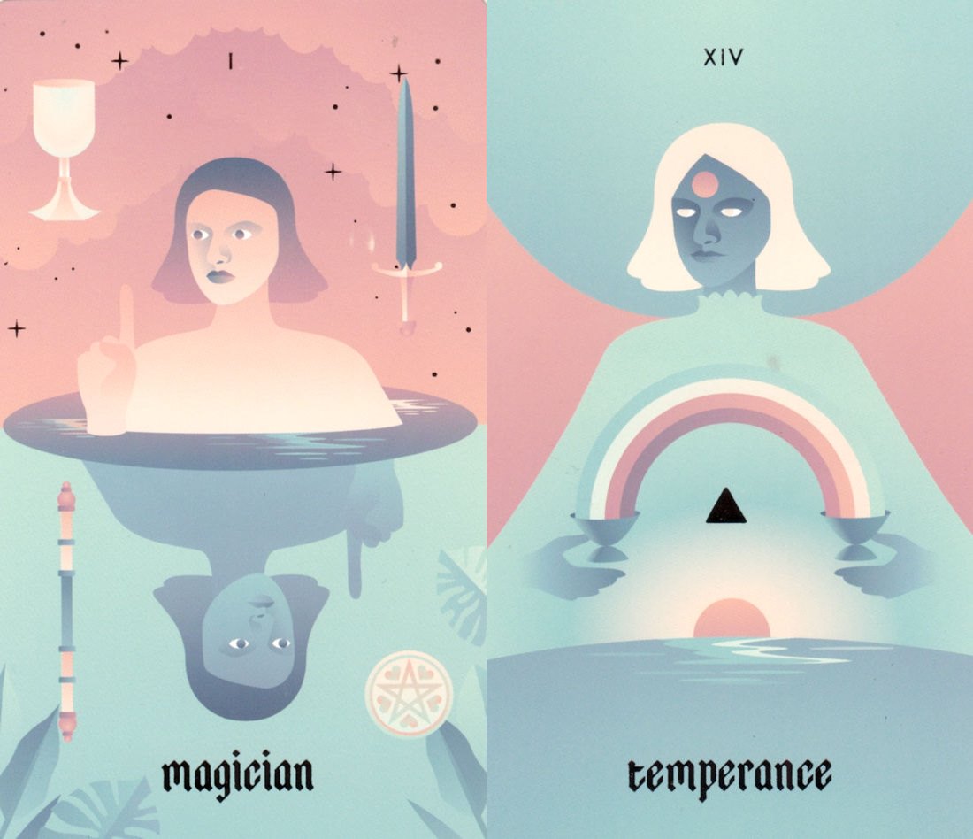 Na verdade, temos nestes dias um trânsito de Mercúrio em Balança, mas retrógrado. Os céus e as cartas alinham-se para nos dar a mensagem: toda a acção e toda a comunicação estão condicionadas. Há que avaliar, comparar, trabalhar mais no campo das hipóteses, usar o lado intelectual do Mago e ajustar a sua intervenção ao modo mais relacional da Temperança, que relativiza, que quer combinar. Se o Mago quer fazer nascer do nada, a Temperança desafia-se a criar a partir do difícil, que é o que se contradiz ou contrapõe.Podem estes dois sabotar-se um ao outro? Na verdade, podem. A Temperança pode fazer o impulsivo Mago perder a paciência e desistir, o Mago pode atropelar as regras no tabuleiro de moderação em que se joga a acção da Temperança. Mas podem também ajudar-se, dando o Mago à Temperança o desejo de arriscar, trazendo a Temperança ao Mago um espírito mais conciliador.
