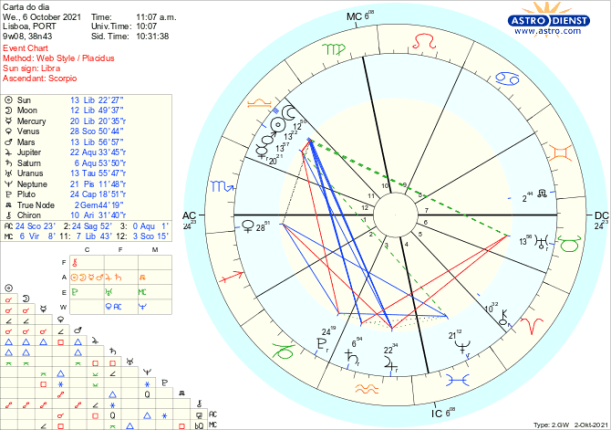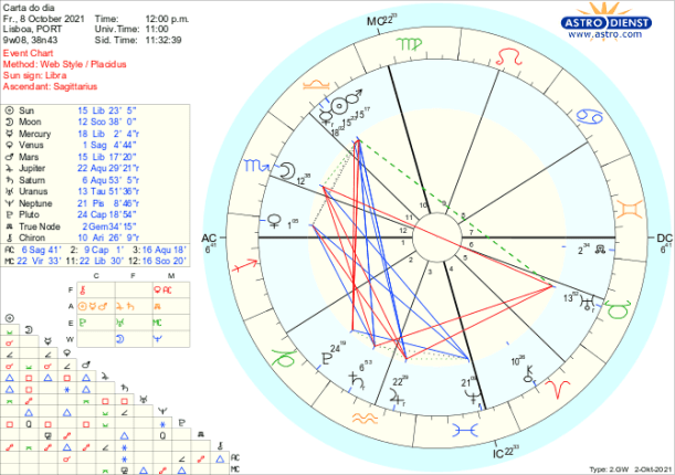 Mas antes da Lua Nova na quarta e do que dela deriva, temos, esta segunda feira de atender aos detalhes pendentes com a Lua em Virgem a sugerir, pelo trígono a Urano e a Plutão, que se procurem respostas não conservadoras para os velhos problemas, mas também não confusas dada a oposição a Neptuno. E na terça, um trígono da Lua a Saturno cria o desejo de estabilizar as emoções e as questões familiares ou domésticas, estado de espírito fundamental para o que vamos investir de nós próprios na justiça das coisas, na Lua Nova de quarta feira, mesmo se houver turbulência… Depois veremos na Lua Nova de Janeiro 2022 em Capricórnio o que há a corrigir.