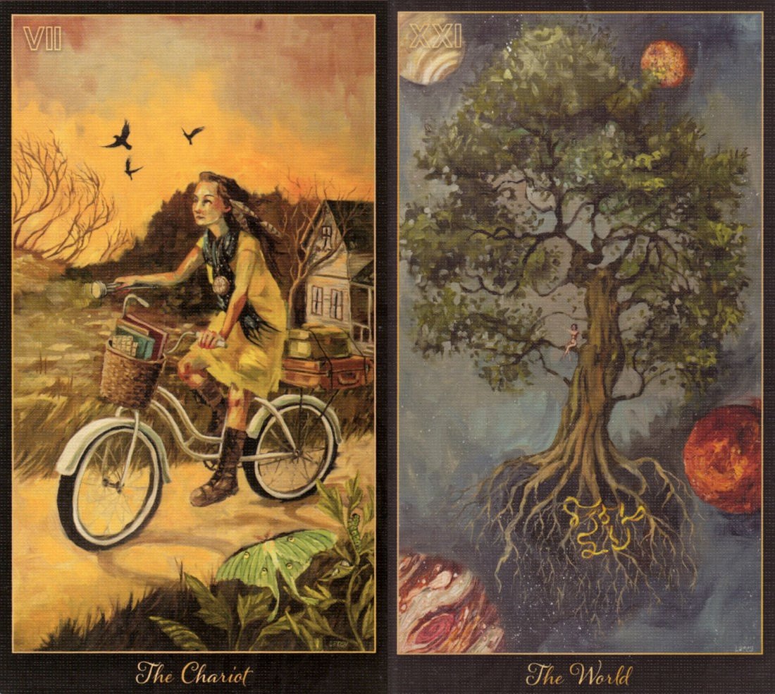 Enquanto ainda pesam na memória recente as energias mais paradas da Temperança e do Dependurado, vem o Carro anunciar movimento e o Mundo uma transição com maturidade. Será que é desta que desencalhamos? A energia do Carro é de desapego, celebrando o momento juvenil da partida de casa, em busca do próprio caminho. Há uma certa dose de mágoa, com feridas ainda por sarar, a empurrar esta partida, mas não deixa de ser na essência uma determinação optimista, um desejo de encontrar rumo por conta própria, cada um entregue a si mesmo.