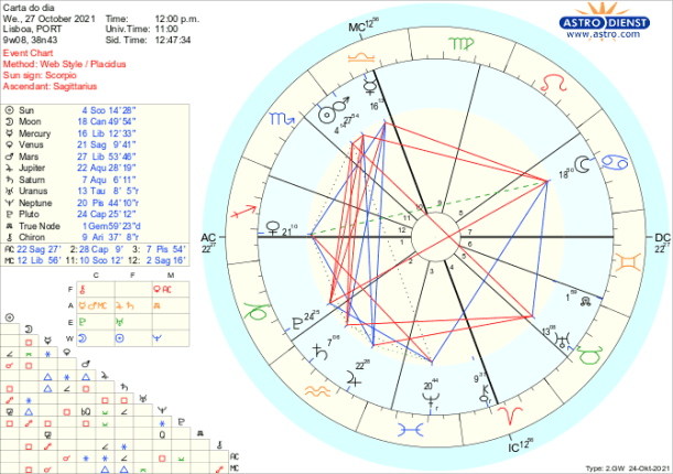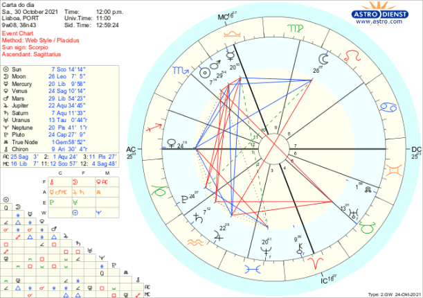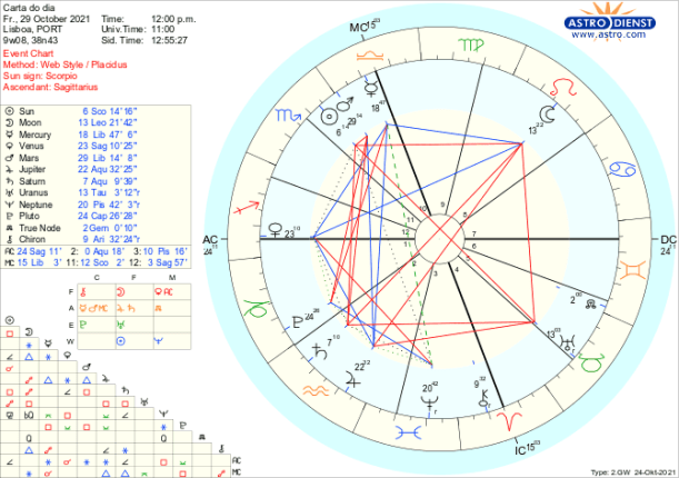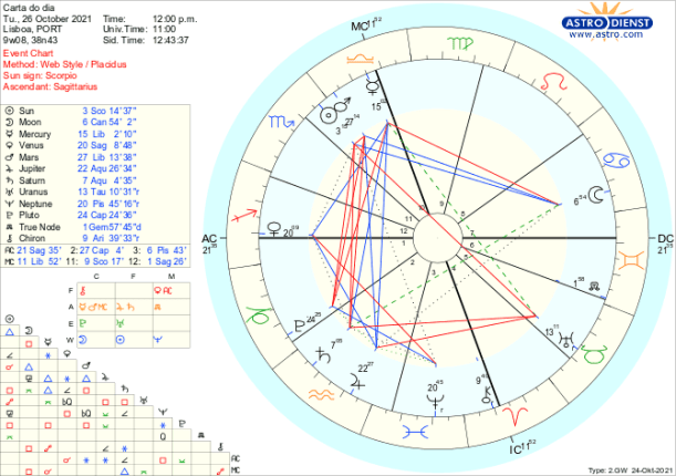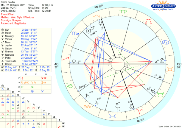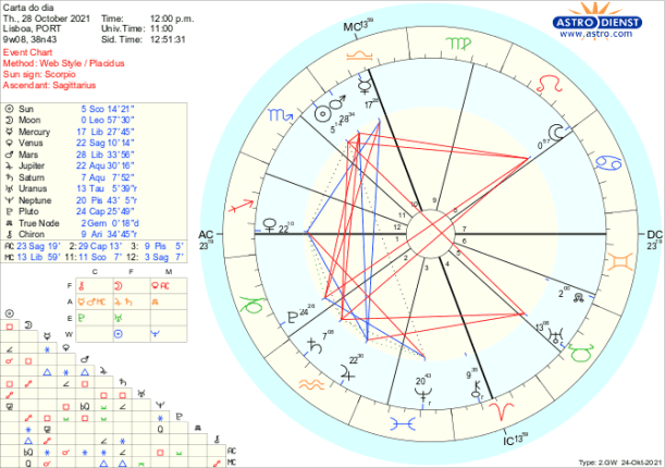 Como pano de fundo temos Plutão, Saturno e Júpiter em moção directa, o primeiro em Capricórnio e os restantes em Aquário, sinalizando o lento transformar das estruturas que nos regem, acompanhadas do que parece ser uma contradição que é um regresso a algumas restrições em simultâneo com a esperança de maior liberdade. Neptuno toda a semana, de Peixes em quadratura a Vénus em Sagitário traz conflitos nas relações porque o optimismo de uns é irrealista para outros enquanto Marte nos últimos graus da Balança – só entra em Escorpião no domingo- depois das rupturas recentes confirma a vontade de transformar os equilíbrios das relações, mesmo se, pela quadratura de Venus, que o regem a Neptuno em Peixes, – não seja ainda bem clara a solução a vir.