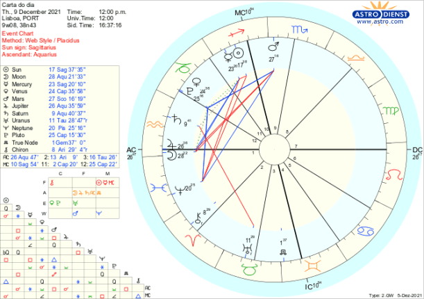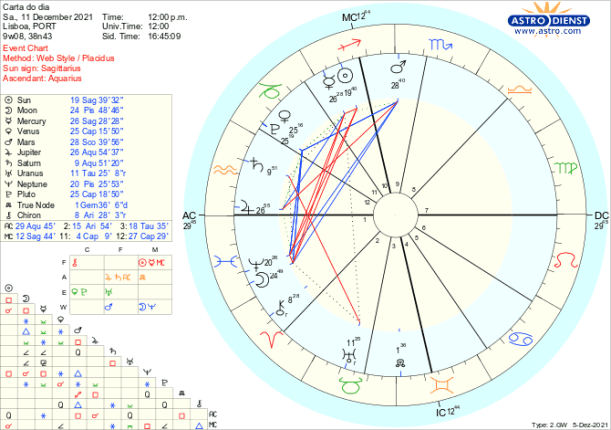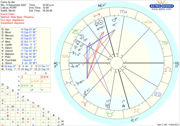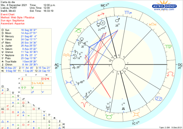 Tudo pareceria até fácil não fosse Saturno, que rege o Capricórnio onde Vénus e Marte se encontram, estar – desde já e até ao final do ano – em quadratura a Urano em Touro, signo que Vénus rege. Trata-se da terceira e última quadratura do ano entre Saturno e Urano, tensão última entre ordem e liberdade, entre conservadorismo e inovação entre repressão e revolução. A contestação às restrições impostas em nome da pandemia, às restrições orçamentais etc, está novamente num crescendo tão intenso quanto mais se alargam institucionalmente os limites e regras sobre as liberdades individuais. Assim, todo o processo desencadeado pela conjunção de Vénus a Plutão ou seja a revisão do que é válido nas relações de poder, à luz de novas revelações vem acompanhado de fortes reações seja por parte dos poderes instituídos seja por quem os contesta. O problema reside na confusão sobre o que é ou não verdade dado que Neptuno, directo desde o início de Dezembro faz-nos acreditar naquilo que queremos que seja verdade o que não quer dizer que assim o seja. É este Neptuno que pode trazer histeria e pânico ás bolsas e mercados, carregar de ideologia as manifestações sociais e levar a pânicos pela ausência de certezas.