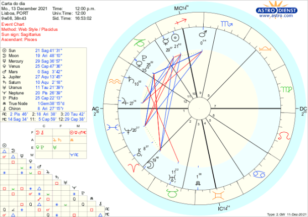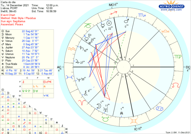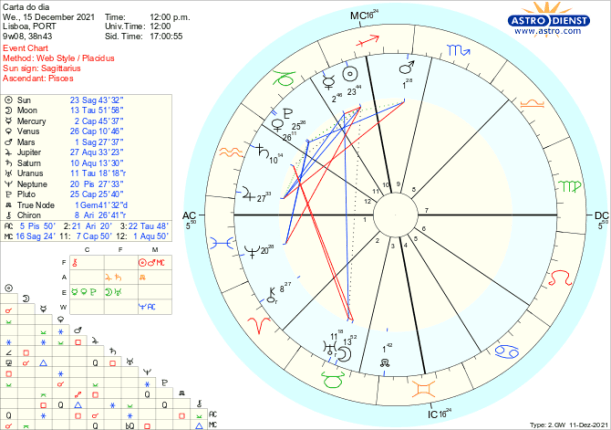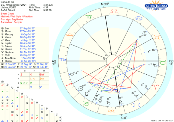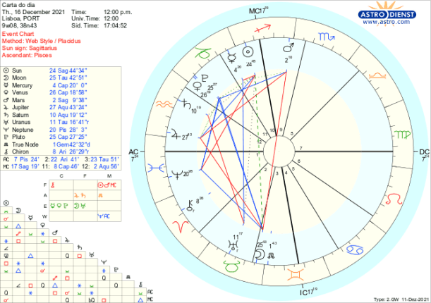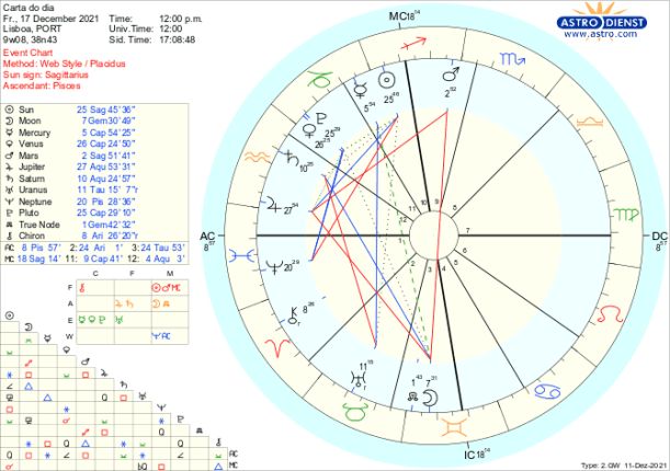 O debate é alargado ao que se passa no mundo, na Lua Cheia pelo trígono a Júpiter em Aquário que também está em sextil ao Sol em Sagitário e confuso ou ideologicamente carregado pela quadratura a Neptuno em Peixes. Caminhamos para a noite mais longa do ano na terça próxima e esta Lua Cheia ilumina as muitas frentes de dúvida/sombra com que colectivamente nos confrontamos. Marte quadrado a Júpiter aumenta a imprevisibilidade das tomadas de posição individuais ou internacionais. Vénus entra retrógrada poucas horas depois da Lua Cheia para nos fazer reflectir sobre o que é de facto importante nos assuntos do coração, do dinheiro, dos acordos pessoais ou políticos. Até finais de Janeiro todas essas áreas estão em cima da mesa para re-avaliação e actualização com Vénus a entrar directa a 20 de Janeiro em trígono a Urano.