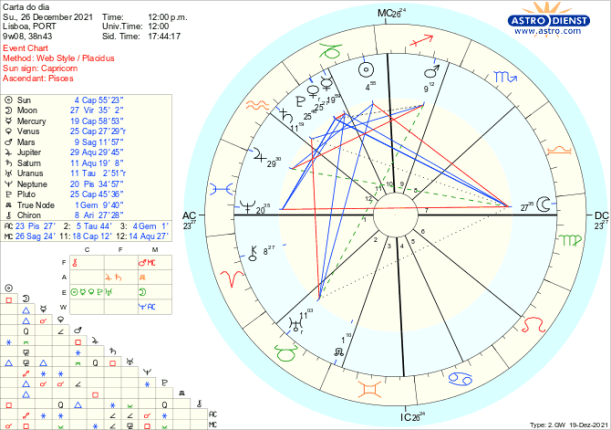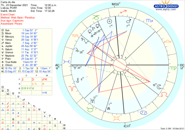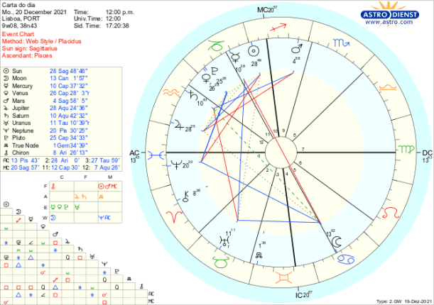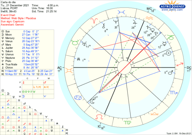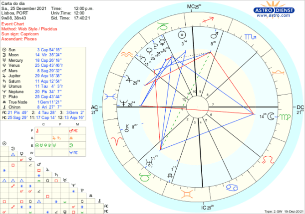 O terceiro marco da semana não tem nada de novo e ainda se vai voltar a repetir em Outubro de 2022. Trata-se da quadratura nos 11 graus entre Saturno em Aquário e Urano em Touro, o conflito entre restrições e liberdade entre responsabilidade e revolução de valores na origem das grandes manifestações mundo fora desde Janeiro até agora com picos em Fevereiro e Junho quando os dois planetas, o do velho e o do novo estiveram, tal como nesta semana de Natal em quadratura exacta. Os conflitosClaro que vai vencer o novo mas não será já dado que Saturno só sai de Aquário em 2023. Temos ainda no Outono de 2022 a quarta e última das quadraturas com a promessa de novas tensões e conflitos sociais e políticos, na quadratura entre os 18 graus de Saturno em Aquário e os 18 graus de Urano em Touro.