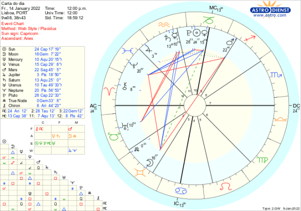 Assim, esta semana, vamos num crescendo transformador do estado das coisas, em direção a esse climax de domingo/segunda 16 e 17 de Janeiro em que nos questionaremos sobre a segurança possível neste quadro de mudanças profundas. Saturno que rege o Capricórnio onde a ordem se desfaz e refaz esta semana, está em Aquário, também toda a semana com Mercúrio conjunto, estacionário, pronto a entrar retrógrado no fim-de-semana face aos resultados da conjunção do Sol e Plutão e sempre em quadratura a Urano em Touro. Ou seja, mantem-se a tensão entre o velho e o novo, entre o controlo e a liberdade, entre as regras de funcionamento do colectivo e as inovações ou revoltas que as pretendem ultrapassar, com a quadratura entre Saturno em Aquário e Urano em Touro – activa desde o ano passado. E nesta semana temos de acrescentar a esse estremar de posições a dificuldade de comunicar a mudança, sem provocar conflito dado que Mercúrio entrou também em cena, em Aquário, quadrado a Urano e conjunto a Saturno. A atenção a este desafio de comunicação deve ser tanto maior quanto melhor pretendermos antecipar o que estará em jogo no fim de Janeiro, Fevereiro e Março quando sucessivamente o Sol, Mercúrio directo e Vénus directa, ao transitarem o Aquário, activarem o mesmo ponto (em que Mercúrio está esta semana antes de entrar retrógrado), em quadraturas a Urano e conjunções a Saturno.
