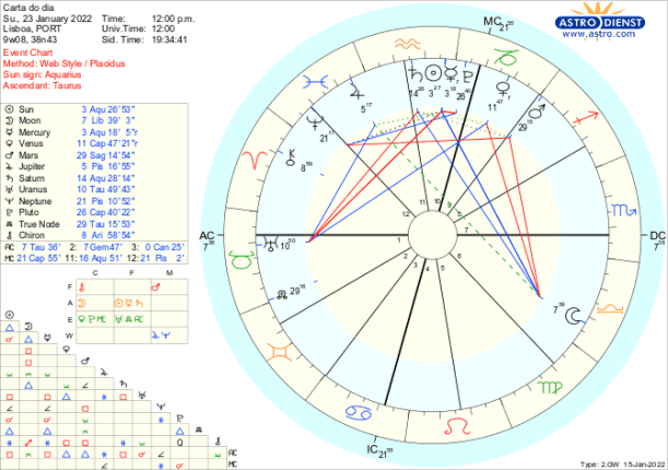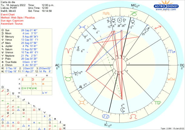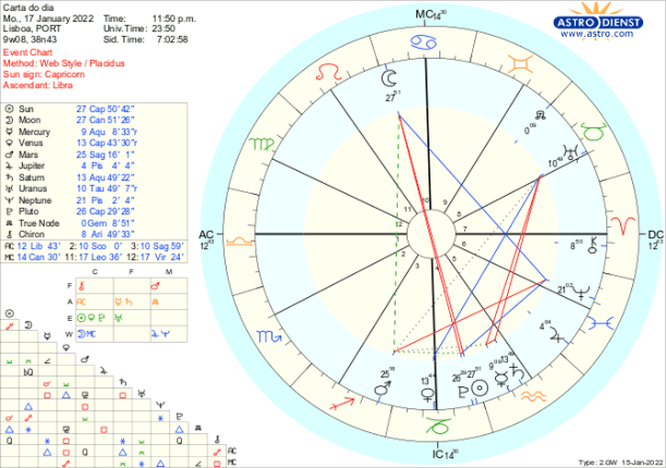 17-24/1/22-Esta semana começa com uma Lua Cheia em Caranguejo, oposta a um Sol conjunto a Plutão a 27 de Capricórnio. Só isto é suficiente para sentirmos em profundidade que algo se extremou e que a situação, estrutura, ordem de vida também foi afectada, mudou. Daqui até à próxima Lua Nova a 1 de Fevereiro, a 12 graus de Aquário é tempo de, sequencialmente pelos aspectos sucessivos da Lua, pegarmos em nós próprios, cortarmos o dramatismo, analisarmos os dados, vermos os equilibrios das relações, o que podemos ou não controlar, quais as expectativas, a ordem possível e só então lançaremos as sementes do ciclo lunar seguinte que as as emoções têm de estar alinhadas com o colectivo, com os grupos em que nos inserimos. O que a Lua Cheia onde hoje tem de pessoal ou solitário, terá a próxima Lua Nova de esforço de integração e solidificação coletiva face a forças de ruptura e busca de novos valores, já que Saturno lhe fará também conjunção e Urano quadratura….