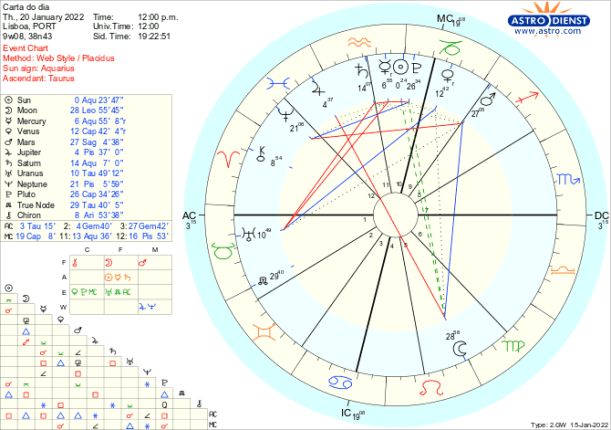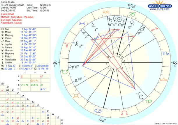 É também no dia 30 de Janeiro que Vénus entra directa- está retrógrada desde 20 de Dezembro em Capricórnio quando fez conjunção a Plutão. A sua entrada em directo, em trígono a Urano, abrirá certamente o caminho para gradualmente nos relacionarmos com menos restrições ou acordarmos mudanças institucionais, mas o processo pode ser lento já que Vénus só volta ao ponto de onde partiu retrógrada em Dezembro, no início de Março, em nova conjunção a Plutão, conjuntos também a Marte, a 3 de Março.