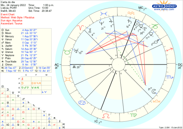 E assim, com Urano já directo e o Sol em Aquário, a caminho dessa Lua Nova dia 1 de Fevereiro, estaremos mais conscientes do nosso papel nesse processo de transformação colectivo. É interessante ver que no dia das eleições em Portugal, 30 de Janeiro, a Lua vai estar conjunta a Plutão sinal de profundos conflitos de interesse, de transtorno do status-quo, resposta à Lua Cheia de dia 17, data em que começou a campanha eleitora, com a Lua oposta a Plutão. No rescaldo, dia 1, Plutão vai estar em trígono ao Nódulo Norte mas Sol, Lua e Saturno vão estar em quadratura a Urano. São muitos sinais de energias contraditórias e de instabilidade colectiva, num dia de Lua Nova em Aquário semente de um ciclo lunar em que se definem caminhos colectivos. Apesar de se esperar a definição de caminhos na Lua Nova de dia 1, o facto é que Mercúrio continua retrógrado – entrou retrógrado na sexta-feira 15 e só fica directo a 5 de Fevereiro.