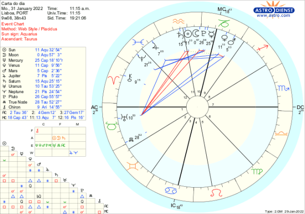 Daí a importância do que for plantado na Lua Nova de terça-feira onde é bem patente, por um lado com Marte e Vénus e Capricórnio em quadratura a Urano em Touro, que estamos prontos para, a bem ou a mal, defendermos a diferença. Por outro, com Mercúrio ainda retrógrado conjunto a Plutão também em Capricórnio, há o desejo de uma lógica de governo das coisas ou organização de vida profundamente diferente, alimentadas por um ideal simbolizado pelo sextil a Neptuno em Peixes. Por último, é neste contexto de Terra remexida alimenta pela esperança da Água – que outro sextil de Vénus e Marte vai buscar a Júpiter em Peixes, – que cai a semente de liberdade e inovação de uma Lua conjunta ao Sol em Aquário mas que, por ocorrer conjunta a Saturno, ainda quadrado a Urano, terá dificuldades em se desenvolver como projeto diferente, sujeito ao ónus do passado, a forças Saturninas difíceis de abalar e que serão muito em breve contestadas por Marte- quando este , entre dia 8 e dia 16 de Fevereiro- dia de Lua Cheia , começar por fazer quadratura a Urano e acabar em conjunção a Marte, num culminar das tensões que desde agora se desenham.