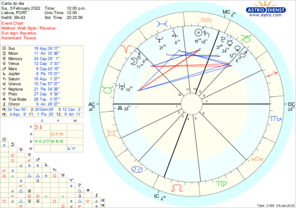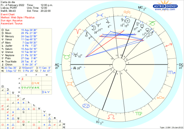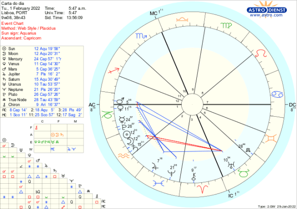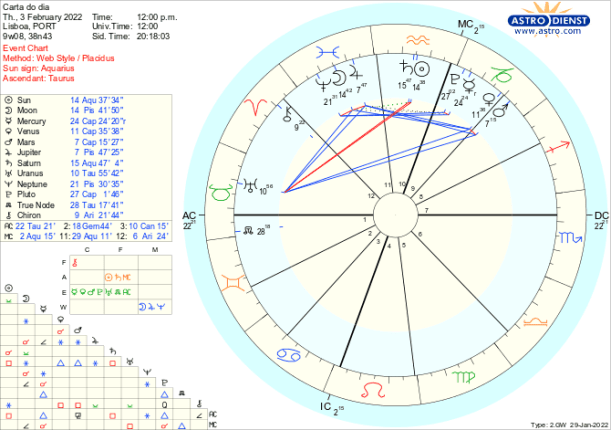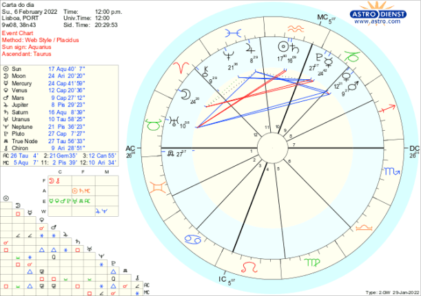 1-6/2/22- A Lua Nova na terça-feira dia 1 dá-nos a tónica de Fevereiro- que já é um tema que subsiste do ano passado- inovação ou continuidade, valores individuais ou regras colectivas? É a quadratura de Urano a Saturno que marcou 2021 que se prolongou até este início de ano e se repetirá no final do ano, como se os eventos desta semana tenham de ser sujeitos a uma tensa avaliação antes de entrarmos em 2023.
