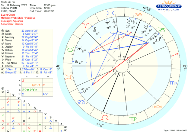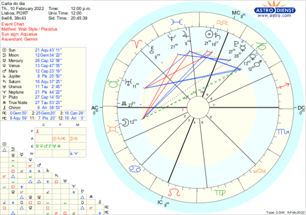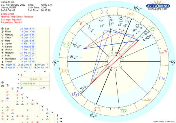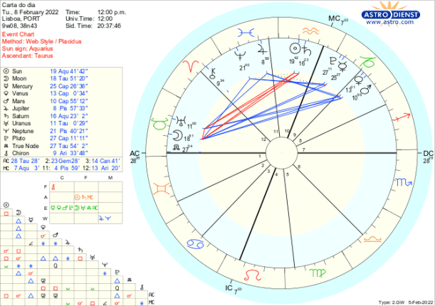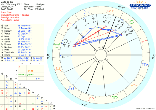 Esse perscrutar sistemático e profundo, o encarar das sombras face ao que tem de mudar ganha ainda mais relevância quando tomamos consciência que a conjunção de Mercúrio a Plutão ocorre em trígono ao Nódulo Norte e em sextil a Neptuno. Esse trígono indica que bem vistas as coisas estaremos a ganhar terreno apostados em novos valores e o sextil diz que estamos a avançar também no caminho de realizar um qualquer sonho ou ideal de vida, pessoal ou colectiva. O Sol, em Aquário, está a afastar-se da conjunção que fez a Saturno no final da semana passada e queremos olhar para a vida em conjunto, para a participação social, com outra liberdade.
