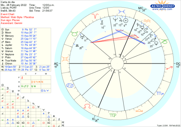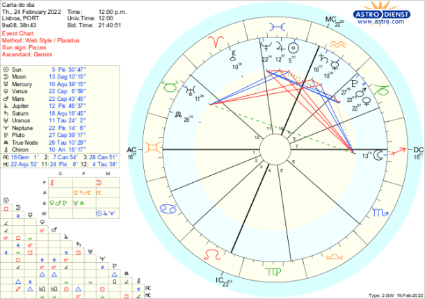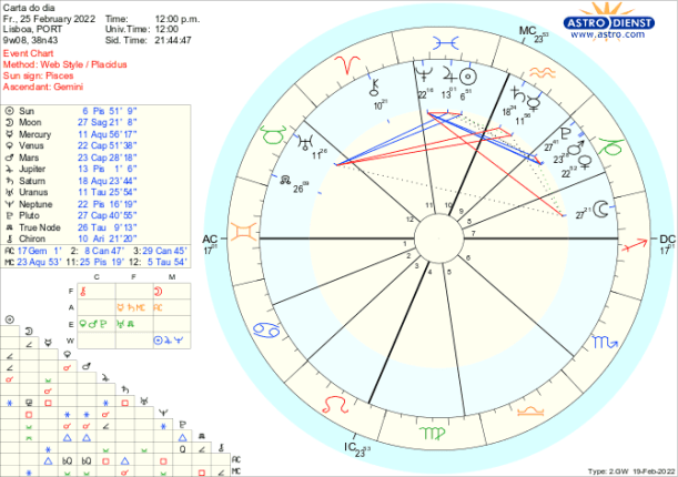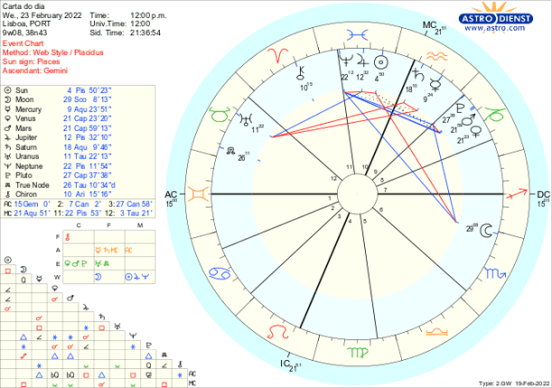 21-28/2/2022: Sol, Júpiter e Neptuno em Peixes….Vénus, Marte e Plutão em Capricórnio…Ou não queremos ver o que se está a passar ou a ideologia política, a fé ou fantasia pessoal comandam a acção. Esta tem duas faces, a diplomática, da ambição das boas relações, com regras e contas certas, a de Vénus e a de afirmação de vontade pessoal, de defesa organizada, de ataque à ordem estabelecida, de guerra, a de Marte. Avançam ambos os planetas, as duas faces, as duas estratégias simultâneas, para uma conjunção a Plutão em Capricórnio, na primeira semana de Março. Será aqui que os resultados das posturas de dois gumes terão o maior impacto, a bem ou a mal algo tem de mudar, nas estruturas políticas, financeiras colectivas ou na ordem das nossas vidas, na casa do horóscopo onde estiverem os graus finais de Capricórnio.