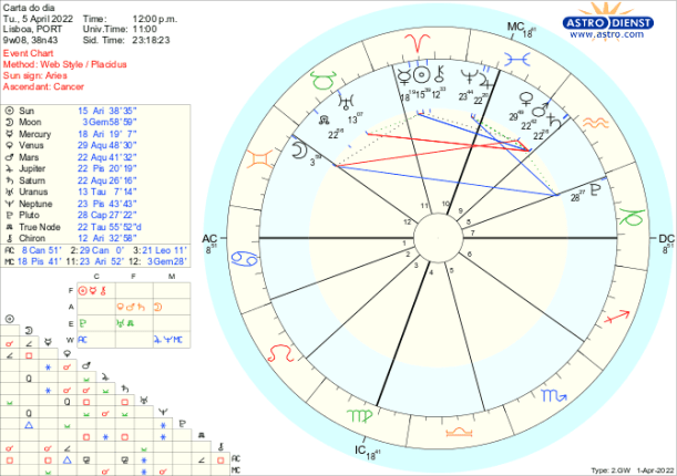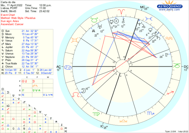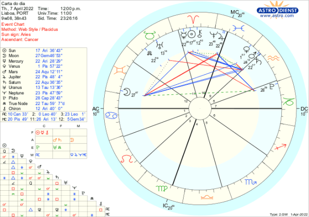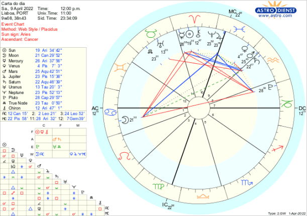 Já se viu que enquanto Marte estiver sob Saturno, pelo menos até quinta feira, temos de pôr os travões a todas as pretensões e isto aplica-se também, à forma como nos exprimimos porque Mercúrio tal como o Sol e Quíron está em Carneiro, regido pelo planeta que submetido às forças maiores simbolizadas por Saturno. O final da semana será particularmente controverso porque Mercúrio em Carneiro faz quadratura a Plutão em Capricórnio e a lógica de acção vai estar em choque com os poderes no terrenos, as forças estruturantes contra as quais nos queremos afirmar. De seguida, depois de dia 11 , Mercúrio passará ao Touro e o entendimento das coisas, a sua avaliação, vai depender de resultados palpáveis, mais do que da declaração de intenções.