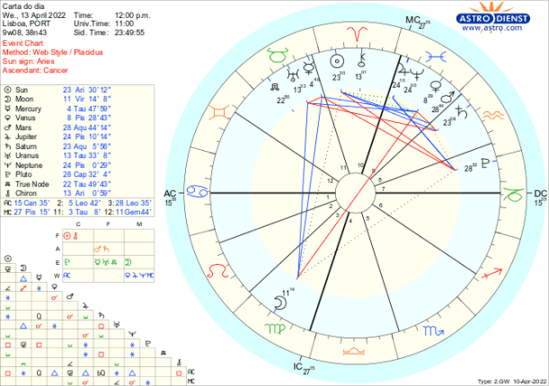 O outro aspecto que também não permite que a presença do benéfico Júpiter conjunto a Neptuno em Peixes traga grande impacto suavizante na rigidez dos ângulos entre os restantes planetas lentos é o facto de estarem a fazer um ângulo de 30 graus a Saturno e ao Sol- é um olhar dissonante, um aspecto de fricção em que nenhum reconhece o outro nem tem a mesma perspectiva- como se fosse o que é bom para um lado e o que é mau para outro, sem interferência, sem se apaziguarem… O mesmo se passa toda a semana entre Quíron em Carneiro e Urano em Touro e entre Plutão e Marte na quarta feira.