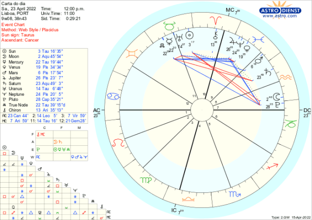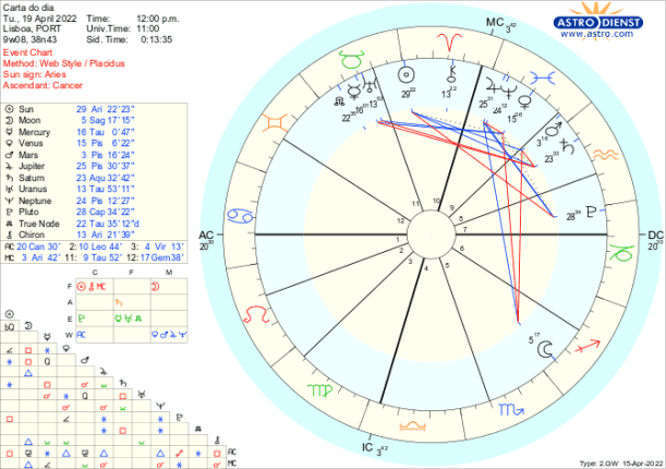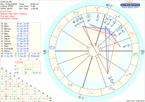 Será no início e no fim da semana que maiores tensões podem advir, dado segunda e terça ocorrer o culminar da quadratura do Sol em Carneiro a Plutão em Capricórnio. É um aspecto de conflito bélico, de discussões de ego em casa -ou guerras no mundo- que a Lua, carregada de emoções intensas – pelo seu trânsito em Escorpião até ao final de terça feira, – vai traduzir em retaliações ou imperativo de controlo profundo das situações. É esta mesma Lua que, sábado e domingo 23 e 24 de Abril, vai fazer conjunção a Plutão e de seguida conjunção também a Saturno em Aquário, numa resposta aos desenvolvimentos da Lua Cheia de dia 16 em que, a partir da Balança, se opôs ao Sol em Carneiro e fez quadratura a Plutão.