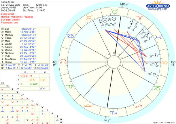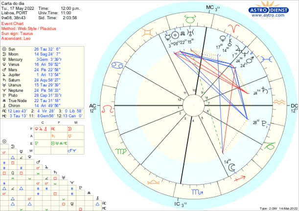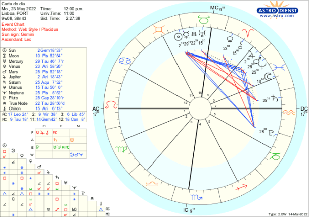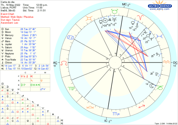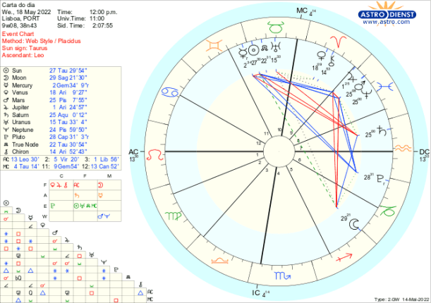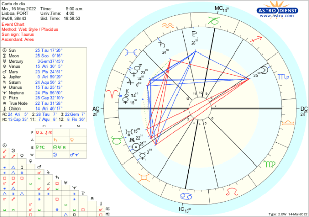 Assim, esta semana, passado o eclipse, e na rota decrescente da Lua até à próxima Lua Nova no dia 30, a 9 graus de Gémeos, temos vários temas a que dar atenção. Em primeiro lugar está a retrogradação de Mercúrio que será o regente dessa Lua Nova e que fará a sua conjunção superior- invisível ao Sol no final da semana, dia 22 para entrar directo a 4 de Junho. Como queremos progredir, o que nos falta resolver, quais são as burocracias, tarefas, comunicações sem as quais não haverá andar para a frente no futuro próximo? Em segundo lugar como traçar limites à sensibilidade- ou à contaminação por Covid- com Marte conjunto a Neptuno em Peixes? Em terceiro, porque Vénus em Carneiro- regida por Marte está desconfortável nesse signo e frustrada pela conjunção a Quíron, seremos capazes de sair do desejo cego e procurar entendimentos e harmonia para conseguir formular os novos valores que as emergias em Touro que ela rege pedem?