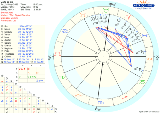 A baralhar esta busca de equilíbrio temos Saturno em Aquário em quadratura a Mercúrio em Touro em contradição com o sextil que faz a Vénus. Uma vez mais, como conciliar isto com as transformações a que Plutão obriga? É como se as regras, limites ou responsabilidade que Saturno preconiza para todos em Aquário desse, espaço, com o sextil, ao impulso do desejo de Venus em Carneiro que Plutão quer ver reduzido… e é como se essa revisão da matéria do que vale ou não vale de Mercúrio retrogrado em Touro fosse ela a travada pela quadratura de Saturno. Que fazer? Apenas usar a nossa própria cabeça, a nossa reflexão e intuição, para medir as consequências dos nossos impulsos e não nos encostarmos apenas ao permitido ou proibido. A responsabilidade individual no sentido da evolução está na cabeça do Dragão ou Nódulo Norte em Touro, regido por Vénus, mas por uma Vénus que se quer sólida, justa e generosa- a Vénus das regências e exaltação em Touro, Balança e Peixes- e como Urano também está em Touro, temos de ir mais longe, inovar, na execução desse desígnio.
