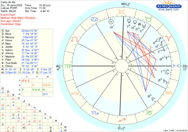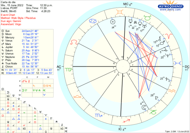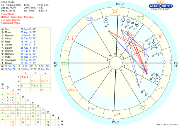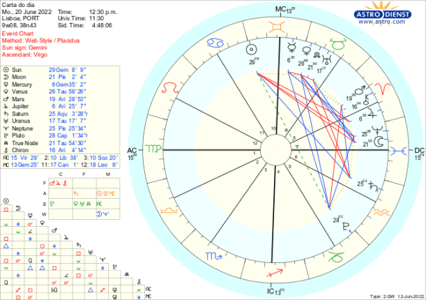 Uma primeira chave possível para afinar o entendimento da situação está no aspecto entre Saturno e Neptuno: um semi-sextil- um grau em que os planetas não se olham mas em que está nas nossas mãos uma abordagem realista que ilumine as decepções possíveis. Ou seja, face a um extremar de interesses na Lua Cheia e dias seguintes, um percepção clara dos factores envolvidos é fundamental. Um segundo aspecto que nos alerta para as atitudes a tomar é a conjunção exacta de Marte a Quíron em Carneiro logo no dia a seguir à Lua Cheia, numa órbita que se prolonga também quase até ao final da semana. A tentação é a de fazermos o que sempre desejámos mas não conseguimos ou pudemos fazer. No entanto todo o discernimento e flexibilidade são necessários porque a Lua na quinta feira em Capricórnio faz quadratura a Marte e a Quíron, em trigono a Urano, Vénus, Nódulo Norte e Mercúrio e em conjunção a Plutão em Capricórnio. Ou seja, se o entusiasmo da pré-Lua Cheia com a Lua em trígono a Marte for excessivo, a revisão de posições será mais dura na quinta feira, com as frustrações bem claras na sexta com a Lua conjunta a Saturno e quadrada a Vénus que também está todo o fim-de-semana quadrada a Saturno. Relações e finanças sofrem novos apertos depois das surpresas da conjunção de Vénus a Urano em Touro no domingo 12.