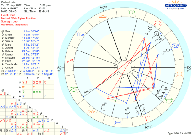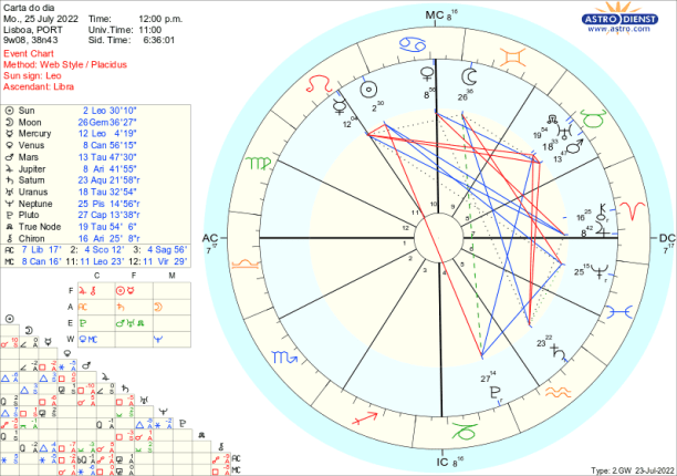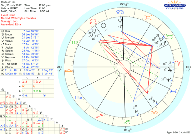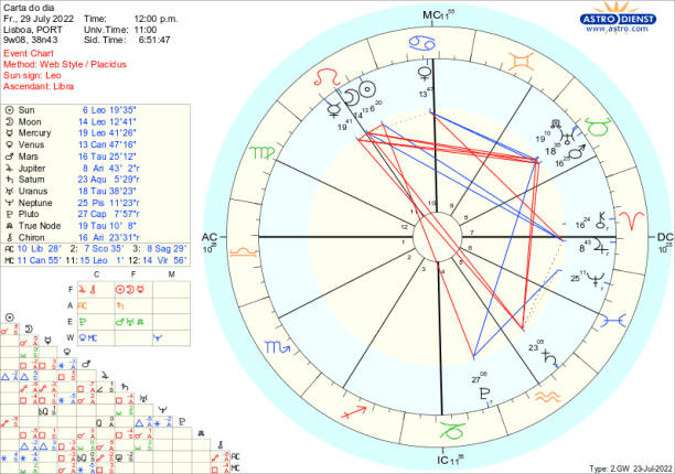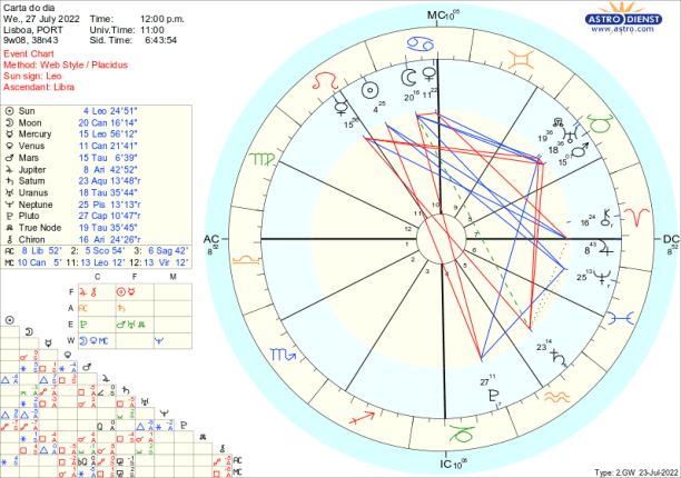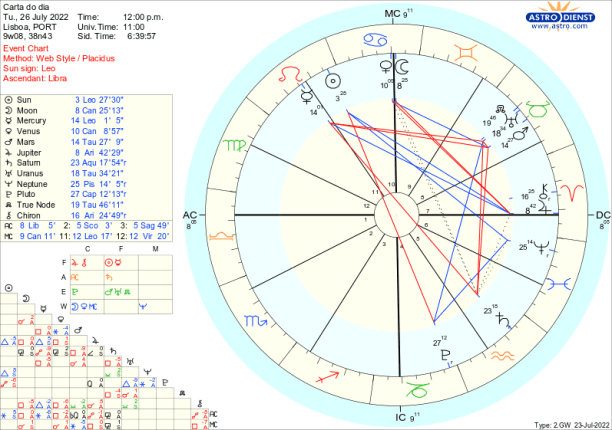 Esta é uma das semana mais relevantes do ano com fortes consequências no desenrolar das vidas e dos acontecimentos colectivo. Isto porque temos um evento raro, indicador do caminho futuro que será a conjunção de Marte, Urano e Nódulo Norte em Touro, em sextil a Venus em Caranguejo, e uma Lua Nova imperial, em Leão, em trígono a Júpiter em Carneiro. É como se tudo se conjugasse para que haja avanços radicais que mudem percursos individuais e globais. Para cada um, será de ver em que casa do horóscopo temos Touro- é aí que sopra o furacão de mudança- e onde temos o Leão, porque é aí que começamos o processo. Nem tudo será fácil e haverá que contar com obstáculos, críticas repressivas ou impedimentos formais porque Mercúrio em Leão que anuncia o novo desenvolvimento vai estar em oposição a Saturno em Aquário e para complicar ainda mais, brevemente também Marte no seu avanço em Touro e o Sol em Leão farão respectivamente quadratura exacta e oposição a Saturno. Mas o que interessa é que desde 2020 e da conjunção Saturno, Plutão que saímos globalmente de uma zona de conforto ou previsibilidade, gradualmente fomos entendendo que não haverá voltar atras, sem sabermos bem ainda para onde vamos e esta semana os dados vão ser lançados e as dificuldades também estarão assinaladas. Algo se começa a desenhar para o futuro próximo.